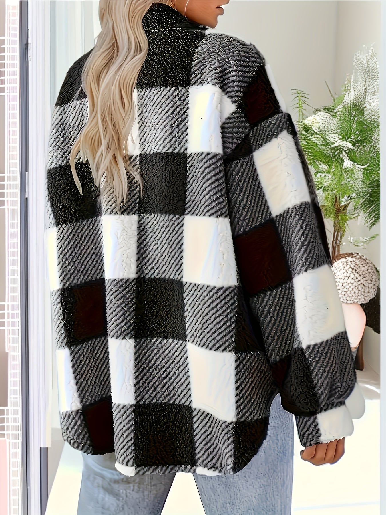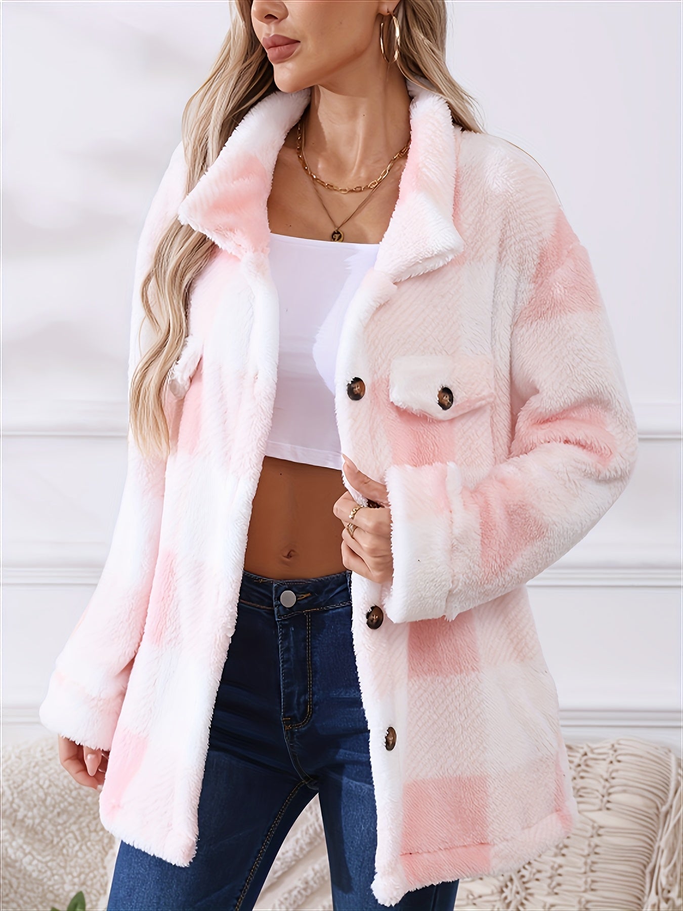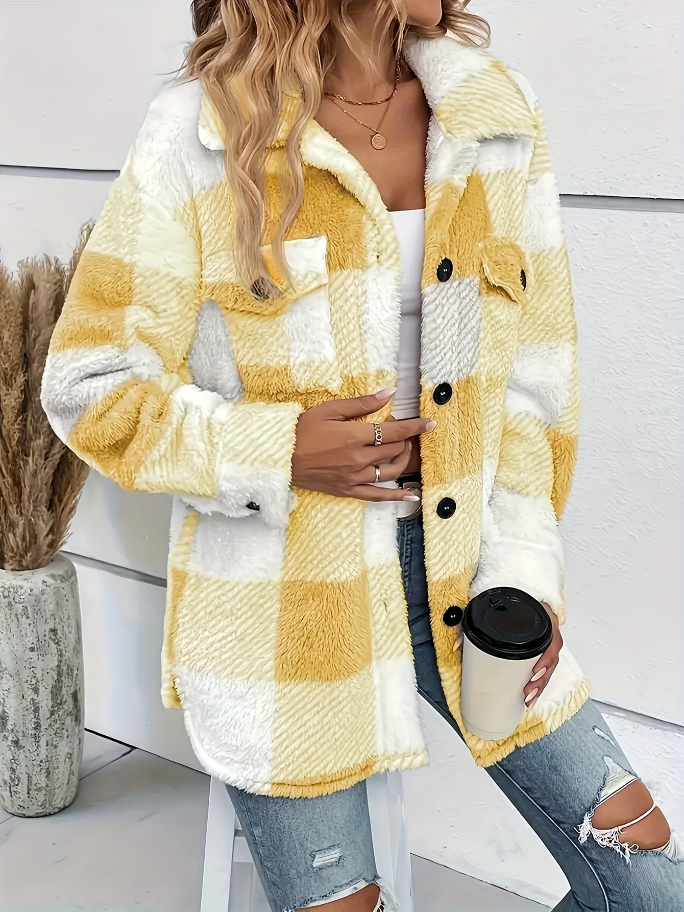This plaid teddy winter coat combines soft, fluffy comfort with a chic button-front design made for cold-weather days.