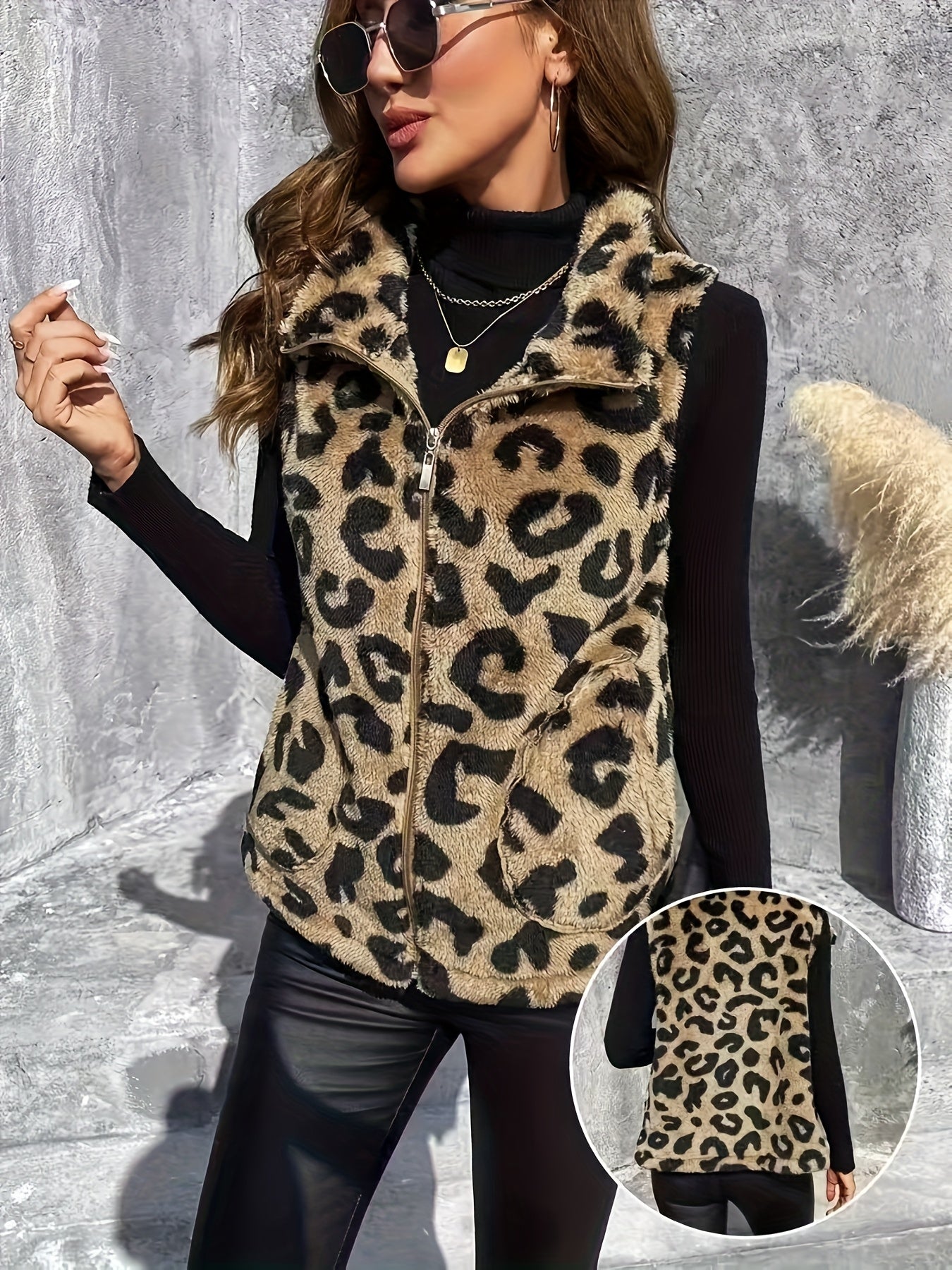 This leopard fleece high-neck vest delivers the perfect blend of bold style and cozy comfort for cooler seasons.