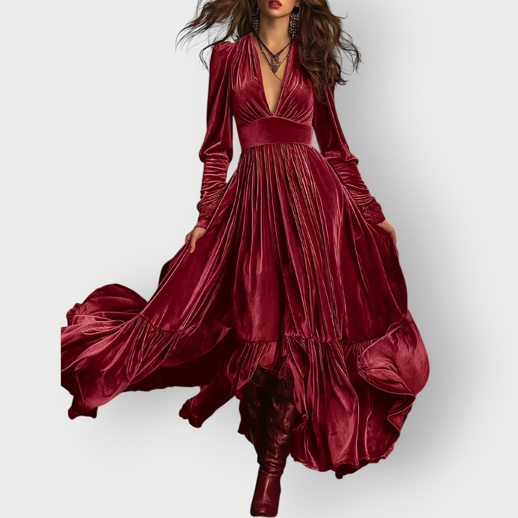 Sharon brings a sense of freedom, mystery, and effortless allure to every step you take. With its flowing silhouette, deep V neckline, and captivating tiered skirt, this dress is designed to glide with you - creating that magical, high-fashion movement that feels straight out of an editorial moment.
